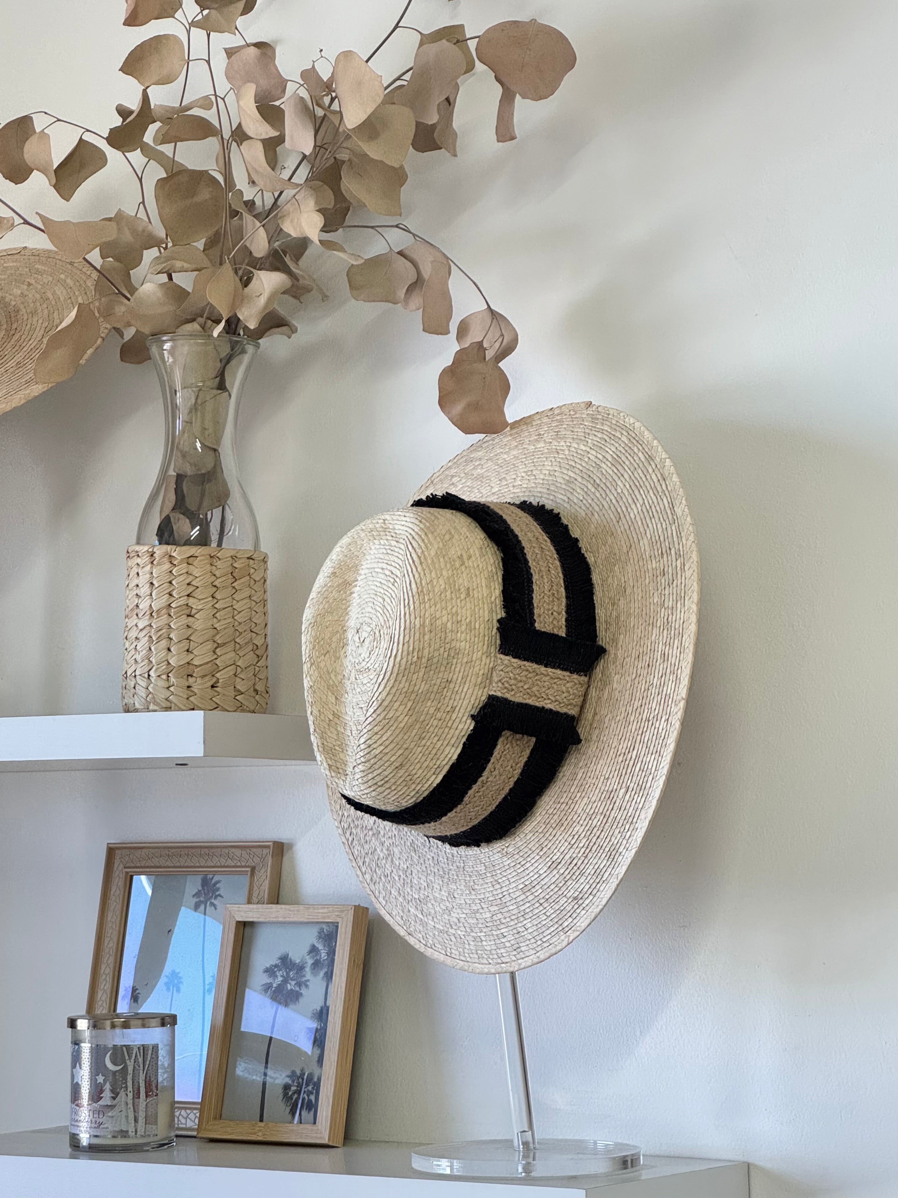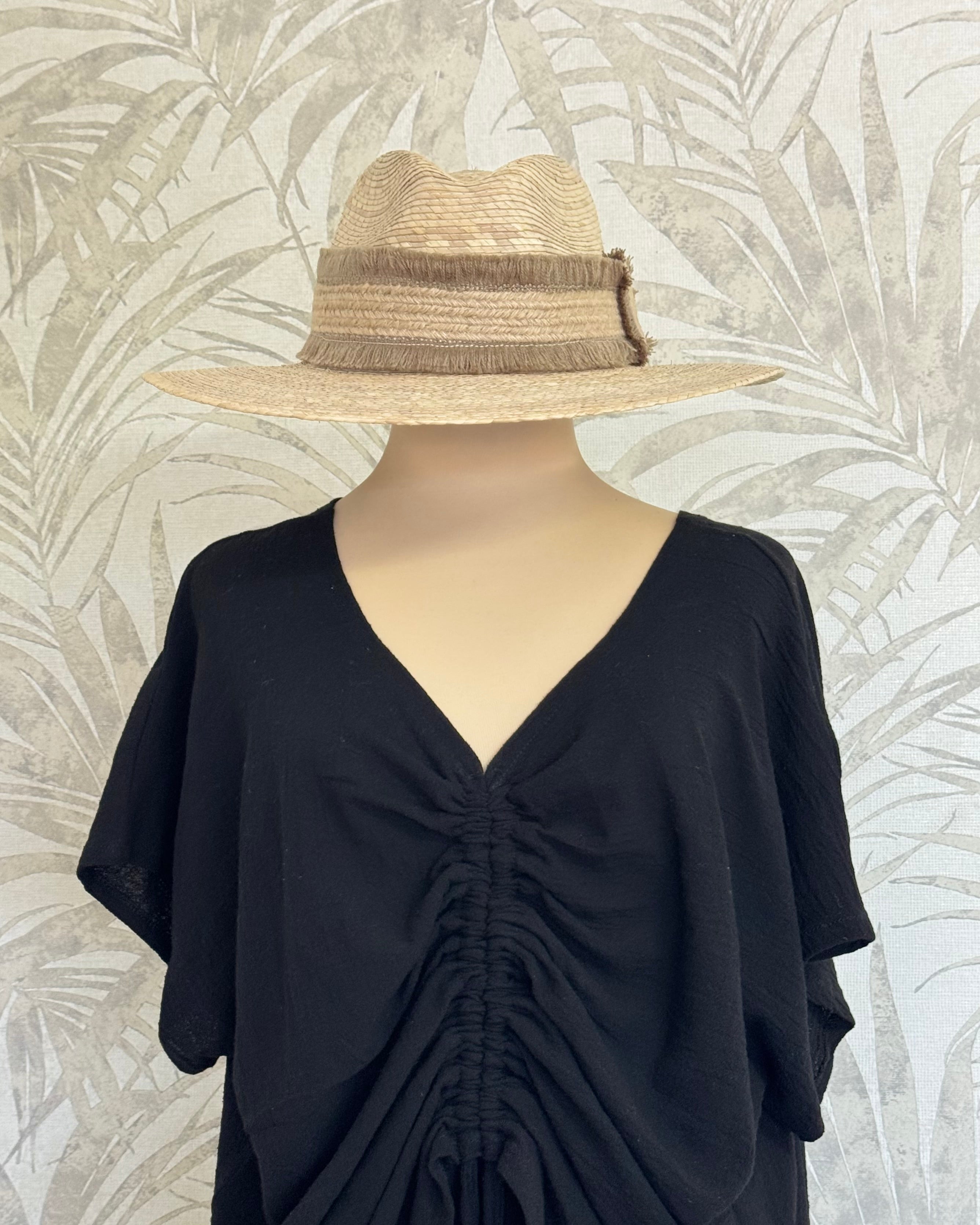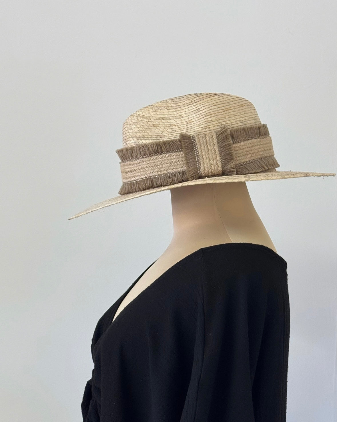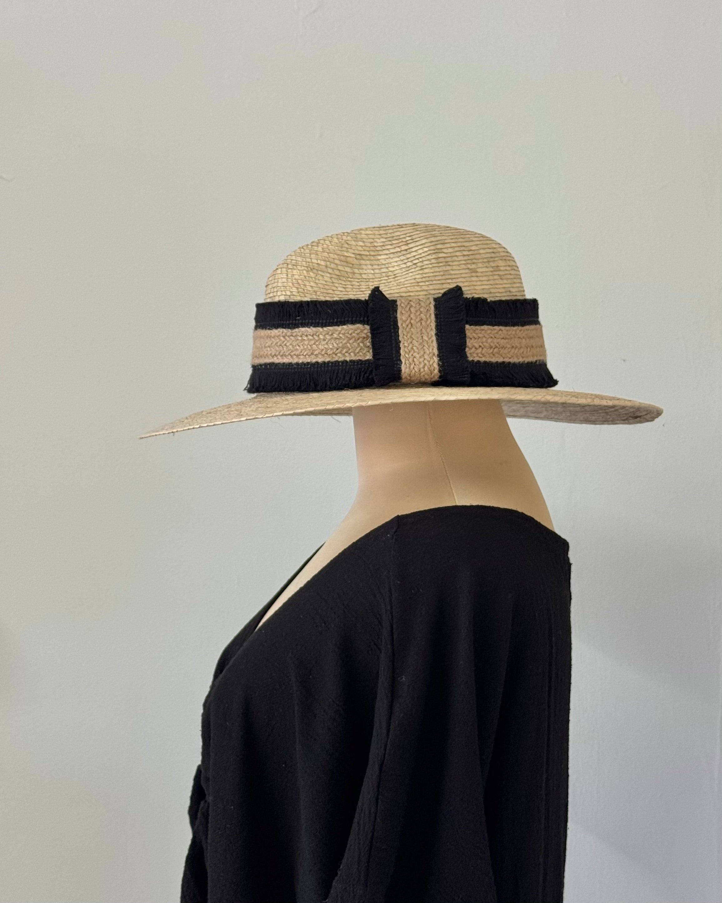 Sombrero mediano de palma tejido a mano por artesanos mexicanos. Decoración de tira gruesa tejida con flecos y borla en la parte trasera. Ala de 11 cms.